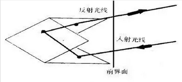 微棱鏡型反光膜的反光原理是依據(jù)光線在三維空間中,從一定的角度入射,在相互垂直的3個平面上發(fā)生3次反射,然后沿著原來的入射方向反射回去,見下圖。根據(jù)制造工藝的不同,在棱鏡面上發(fā)生的反射有兩類:一類是空氣-樹脂界面的(全)反射,另一類是鋁-樹脂界面的反射。
